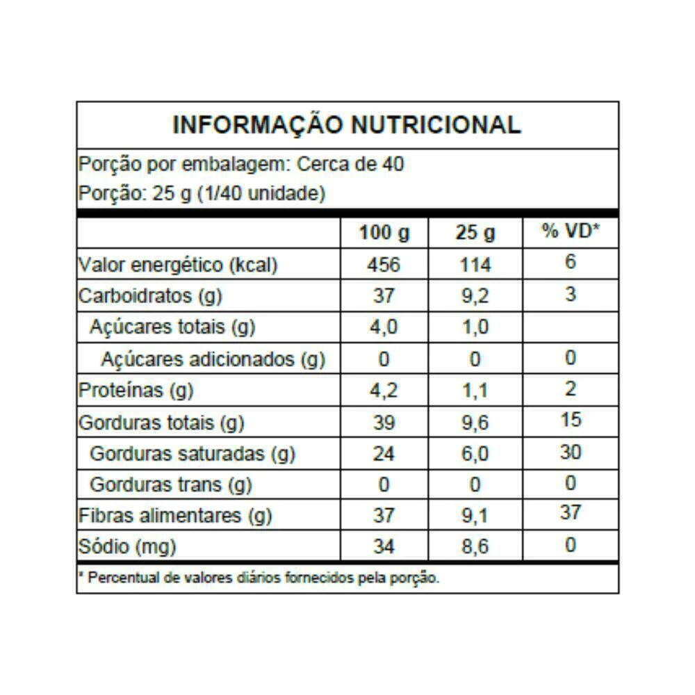 Isomalto oligossacarídeo (fibra de tapioca), manteiga de cacau, massa de cacau, leite de coco, fibra de milho, farinha de coco, edulcorante estévia, emulsificantes lecitina de girassol e polirricinoleato de poliglicerila e aromas naturais. NÃO CONTÉM GLÚTEN.