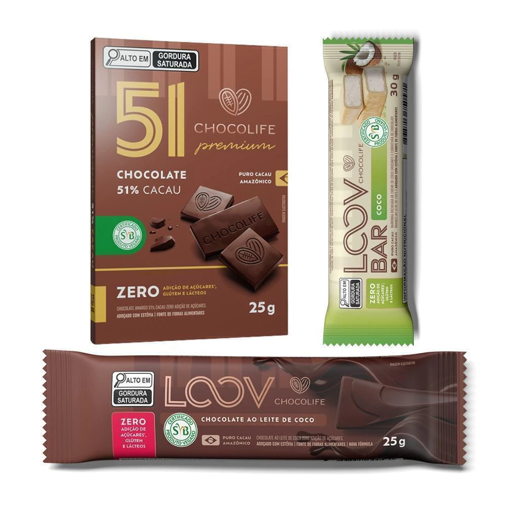 O Kit Chocolife Loov reúne três versões de chocolate saudável, com sabor surpreendente, textura agradável e ingredientes de alta qualidade. Todos os produtos são 100% veganos, zero açúcar, sem glúten, sem lactose e livres de ingredientes alergênicos. Ideal para quem busca praticidade, nutrição e prazer em um só kit.